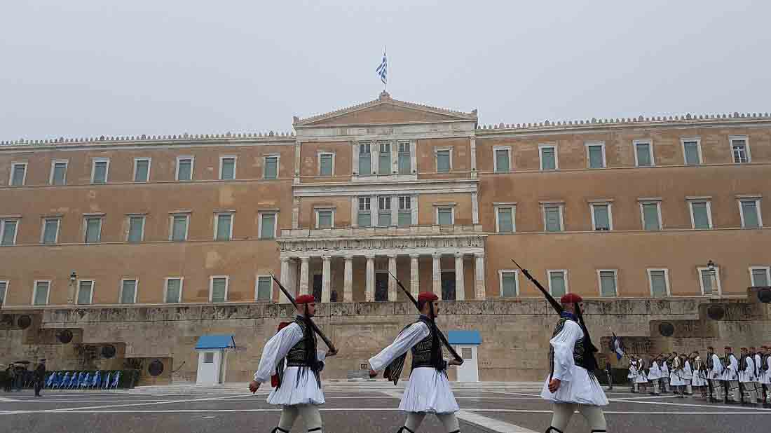 Uma das coisas que aprendemos em Atenas é que o tempo pode mudar muito rápido. Quando alguém perguntar a você se você tem um guarda-chuva, é bom providenciar com algum vendedor na rua. Logo no primeiro dia na capital grega, enquando admirávamos o sol brilhando no céu, fomos perguntados pela recepcionista do hotel se estávamos com um guarda-chuva. Nosso destino era conhecer a troca da guarda no Parlamento Grego localizado a poucos minutos do hotel. Acostumados com o clima brasileiro, logo respondemos que "não teríamos problemas com a chuva". Pois bem, em questão de cinco minutos, tudo mudou e terminamos a manhã encharcados.